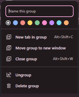 To use them, simply right-click on a tab, and select Add tab to new group. You can give groups different names and colors.